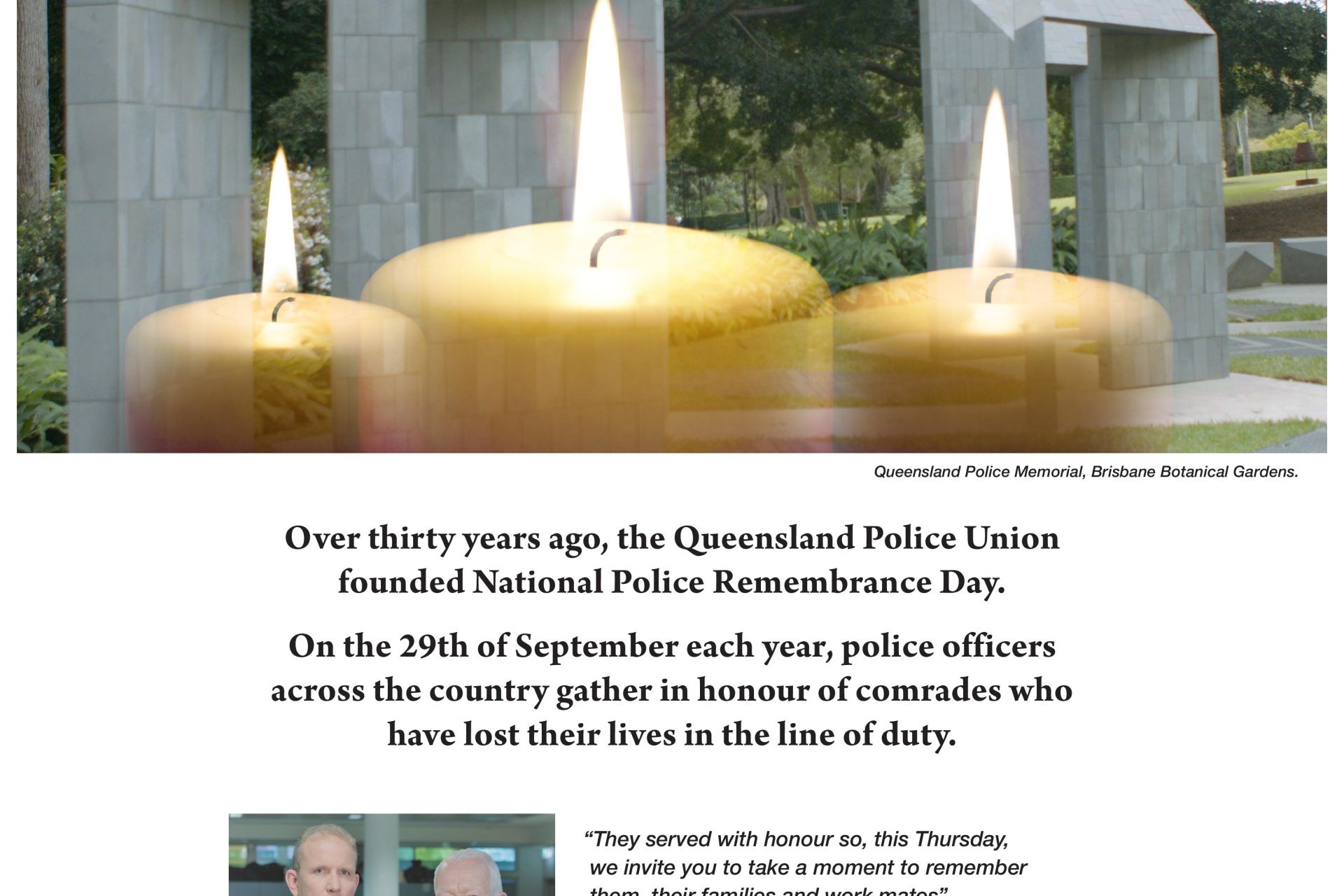 QPUE: National Police Remembrance Day 2023 National Police Remembrance Day is Friday September 29. The Queensland community want to show their appreciation for the job police do, so the QPU is encouraging as many police as possible to participate in Remembrance Services. It’s important to show the relatives & friends of those we have lost that the ‘blue family’ is strong, resilient and will continue to honour their service forever and a day.